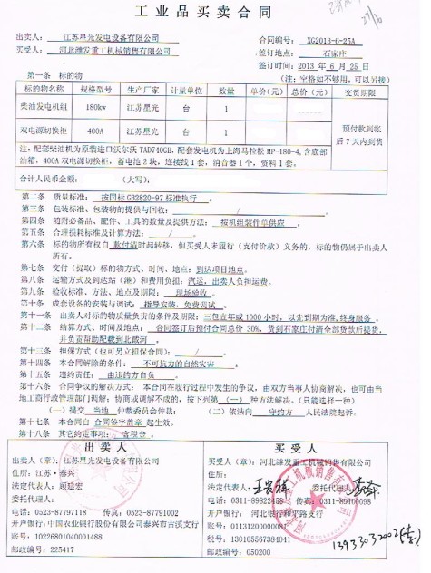 2013年6月25日,河北濰發(fā)重工機(jī)械銷售有限公司與星光公司簽訂發(fā)電機(jī)組買賣合同,合同內(nèi)容為一臺(tái)180KW柴油發(fā)電機(jī)組。
