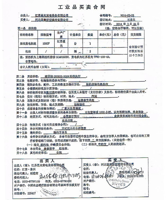 2014年3月25日,經(jīng)過雙方多次溝通協(xié)商,江蘇星光動力集團(tuán)河北分公司與河北國美新型建材有限公司再次達(dá)成合作,并于河北石家莊簽訂工業(yè)品買賣合同。根據(jù)合同,星光動力河北分公司向河北國美新型建材有限公司提供一臺柴油發(fā)電機(jī)。