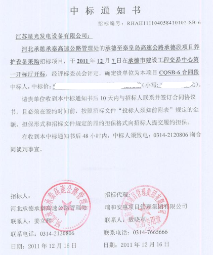 星光成功中標(biāo)河北承德承秦高速公路設(shè)備采購項目