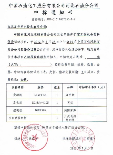 2012年6月28日,中國石化河北承德石油分公司三岔口油庫擴建工程經(jīng)過慎重選擇和比較,最終確定與星光發(fā)電設(shè)備公司進行合作,確定星光為中石化工程八標(biāo)段發(fā)電機組中標(biāo)人。